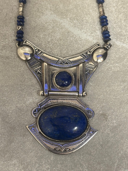 925 Sterling Silver Blue Stone Beaded Vintage Necklace With Blue Colored Center Stone